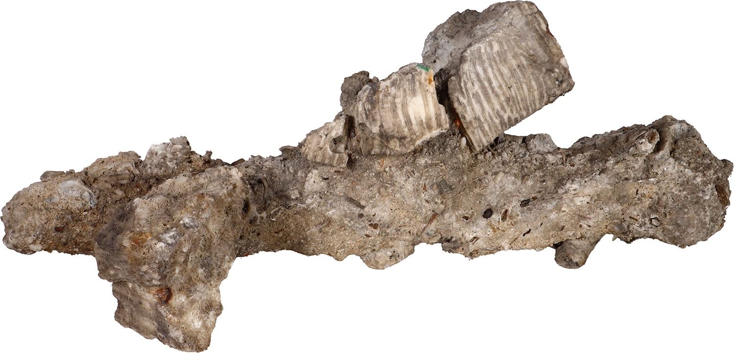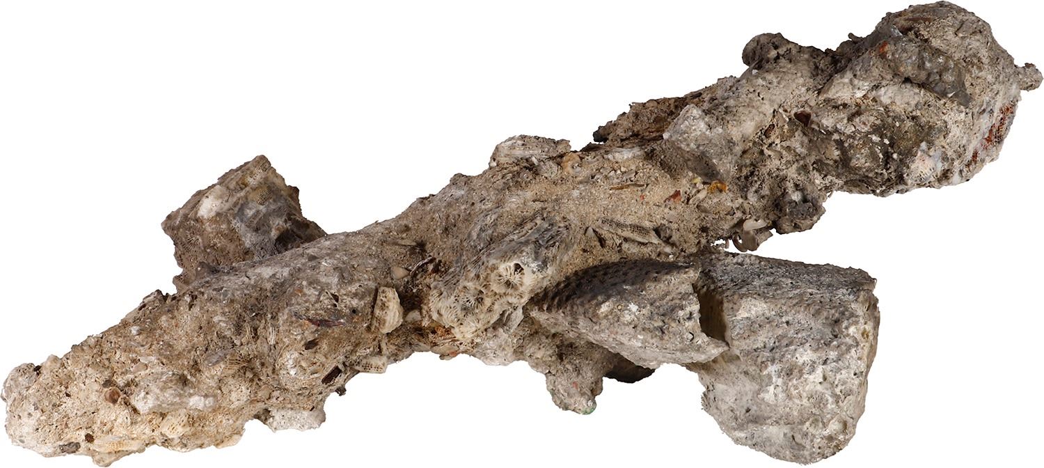 Heavily encrusted iron spike, ex-Guadalupe and Tolosa (1724). 757 grams total. Roughly 9" x 3½" x 3¼". Large spike, still recognizable as such amid a heavy cocoon of dull gray ocean encrustation, attractive pieces of coral affixed here and there. From Guadalupe-Tolosa (1724), with original certificate from Captain Tracy Bowden through his contract with the Dominican Republic and copy of the article "Graveyard of the Quicksilver Galleons" by Mendel Peterson from the December 1979 issue of National Geographic signed by Bowden.
