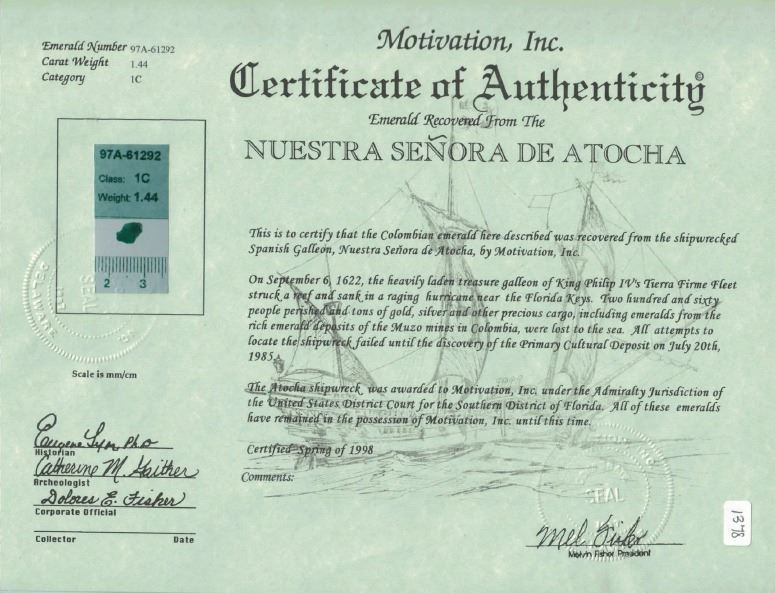High-quality natural emerald, 1.44 carats, grade 1C, ex-Atocha (1622). Roughly 1/2" x 1/4". Very attractive deep green, opaque nugget with a dusting of sedimentation on one side. From the Atocha (1622), with Fisher plastic tag and photo-certificate #97A-61292, plus appraisal and letter.