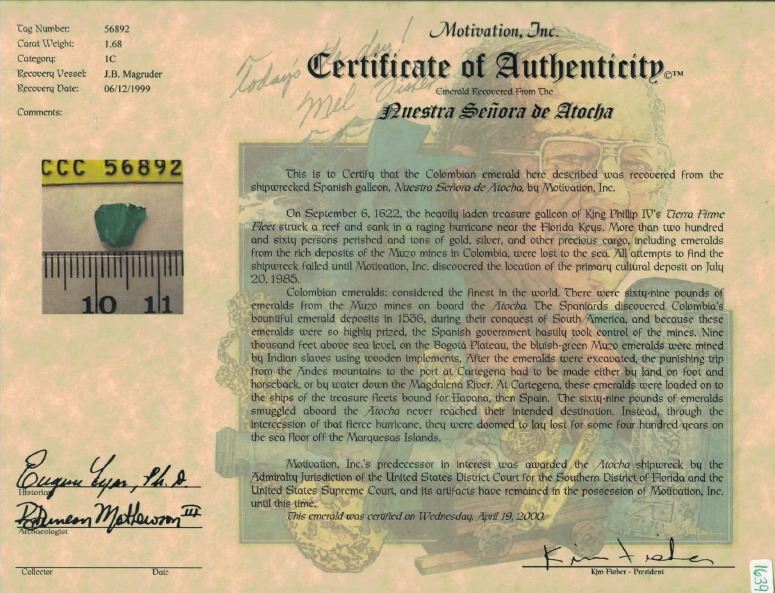 High-quality natural emerald, 1.68 carats, grade 1C, from the Atocha (1622). Roughly 3/8" x 1/4". Crystal and rough surfaces with lovely bright green color amid opaque surfaces. From the Atocha (1622), with Fisher tag and certificate #99A-56892.