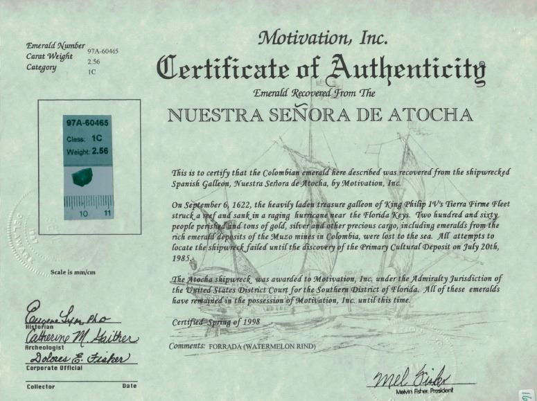 High-quality natural emerald, 2.56 carats, grade 1C, from the Atocha (1622). Roughly 3/8" x 1/4". Mostly crystalline shape with even dark-green color throughout, opaque and with light encrustation on some surfaces. From the Atocha (1622), with Fisher tag and certificate #97A-60465.