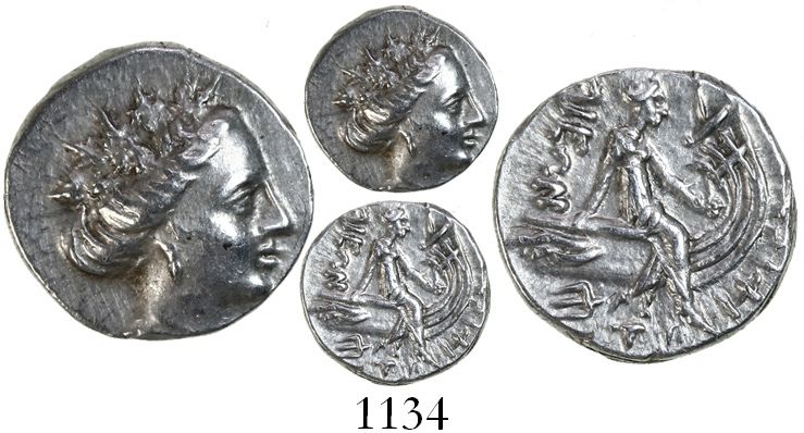 Histiaia, Euboia, AR tetraobol, 3rd to 2nd century BC. BCD Euboia 411; SNG Copenhagen 535. 2.37 grams. Wreathed head of nymph Histiaia right / Nymph seated right on stern of galley; tripod on side of ship, trident below. Bold XF+ with choice details on both sides.