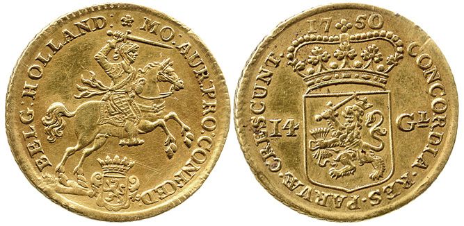 Holland, Netherlands, 14 gulden, 1750. KM-97. 9.8 grams. Bold XF details but cleaned and with evidence on rims of former jewelry mounting.
