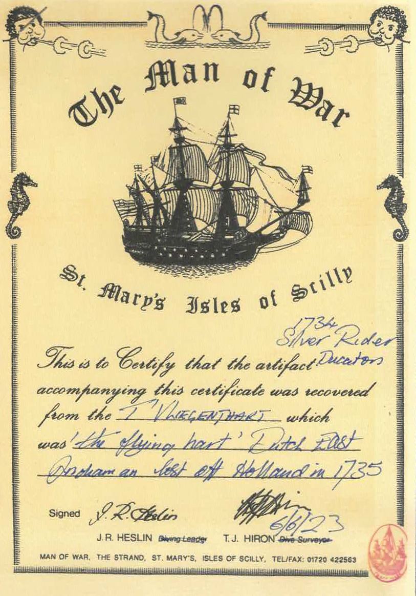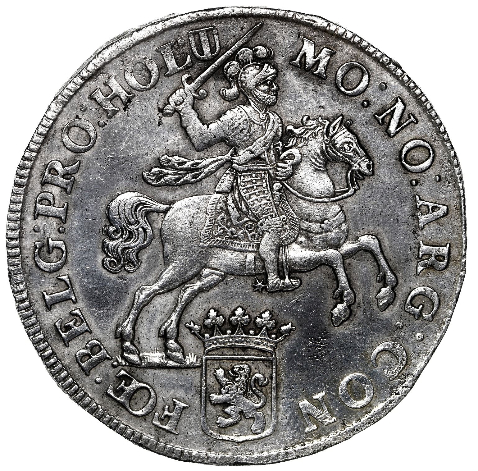 Holland, United Netherlands, "rider" ducatoon, 1734. KM-90; Delm-1014. 32.35 grams. Very choice example with 100% full bold AU details and mirrorlike fields, lightly toned, not Mint State but surely one of the best-struck and best-preserved specimens recovered. With photo-certificate. Recovered from: Vliegenthart, sunk in 1735 off Zeeland, Netherlands
