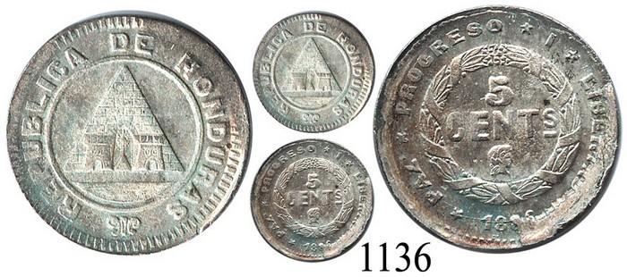 Honduras, 5 centavos, 1886, broken die. KM-54. 1.2 grams. Lustrous BU with extra metal on part of rim due to broken die, incipient toning.