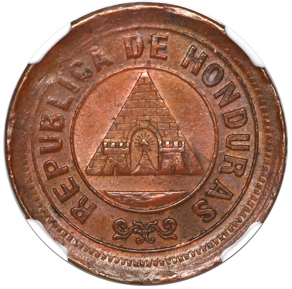 Honduras, bronze 1 centavo, 1890, denomination UN/10, no wreath on obverse, NGC MS 63 BN, finest known in NGC census, ex-Dana Roberts. KM-59. 4.44 grams. From a chaotic period of mixed and concurrent dies, this with denomination UN punched over 10 on reverse (KM-49) but with new obverse, this exceptional specimen with choice details and traces of original copper color and luster, crude rims as usual (as made). Pedigreed to the Dana Roberts collection (stated on label).