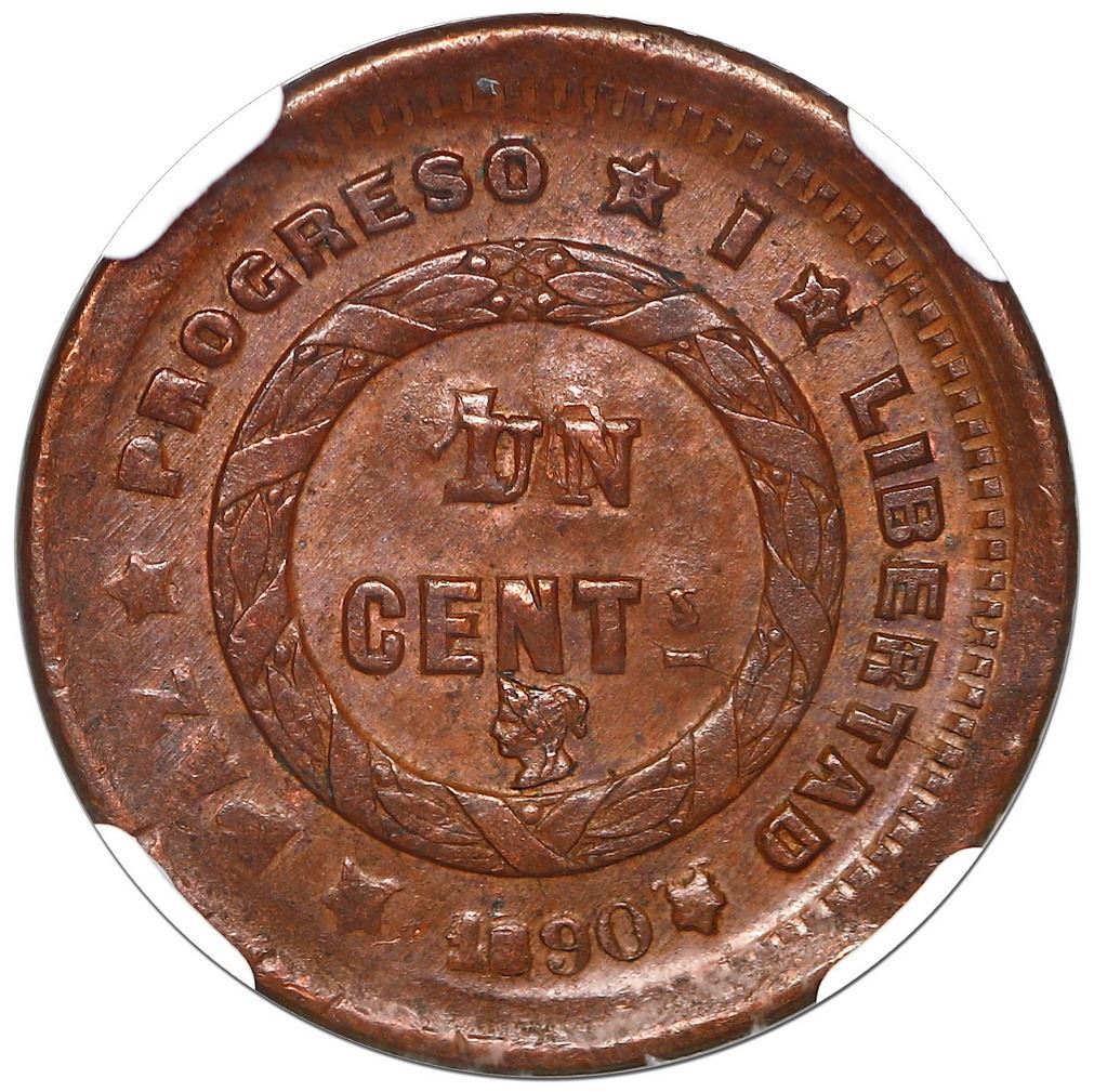 Honduras, bronze 1 centavo, 1890, denomination UN/10, no wreath on obverse, NGC MS 63 BN, finest kno