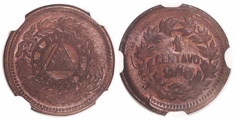 Honduras, copper 1 centavo, 1910, 5c obverse die and 1/2c reverse die, encapsulated NGC MS 64 BN, ex-Dana Roberts. Like the previous lot, this coin attests to the troubles at the Tegucigalpa mint, which created this coin from dies meant for two other, different denominations (5c obverse, 1/2c reverse), the modification to denomination and date on reverse quite obvious here, this specimen rather choice in strike (despite a rim-cud on reverse and corresponding weakness on other side) and preservation, with much original color and luster and no wear or marks at all, far better than just UNC (which KM values at $500) and presumably much better than Lissner's example (which was originally offered by Louis Hudson as graded XF). This specimen is also the only one graded by NGC so far and is therefore the finest in their census. Pedigreed to the Dana Roberts collection.