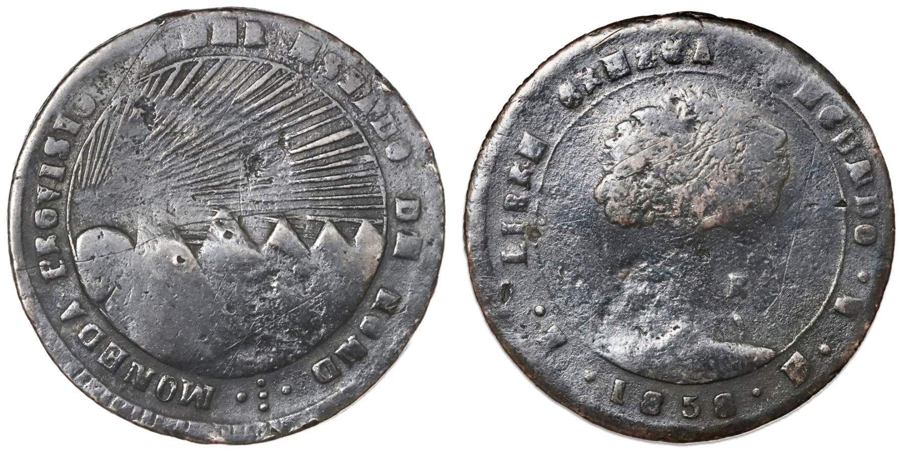 Honduras, copper/lead 8 reales, 1858FL, legend with HOND, NGC Fine details / environmental damage. KM-21a. 15.83 grams. Good strike for the issue with full legends and inner details, a few old scratches and perhaps some graininess but mostly expected for this type, this example almost black from toning. NGC #4770572-004.