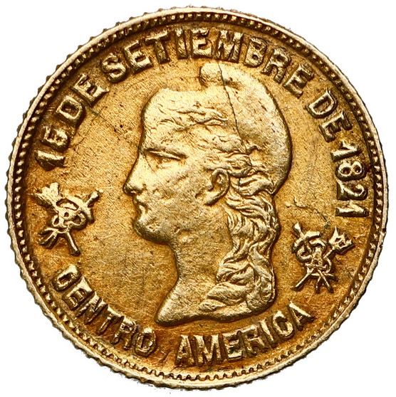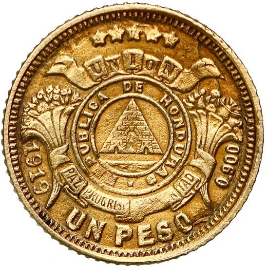 Honduras, gold 1 peso, 1919. Fr-7; KM-56. 1.80 grams. AU, well struck for this crude type with only surface hairlines to note.