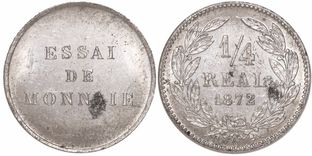 Honduras, pattern aluminum 1/4 real, 1872. 1.03 grams. Lustrous and almost prooflike Mint State with minor marks, small spot of corrosion.