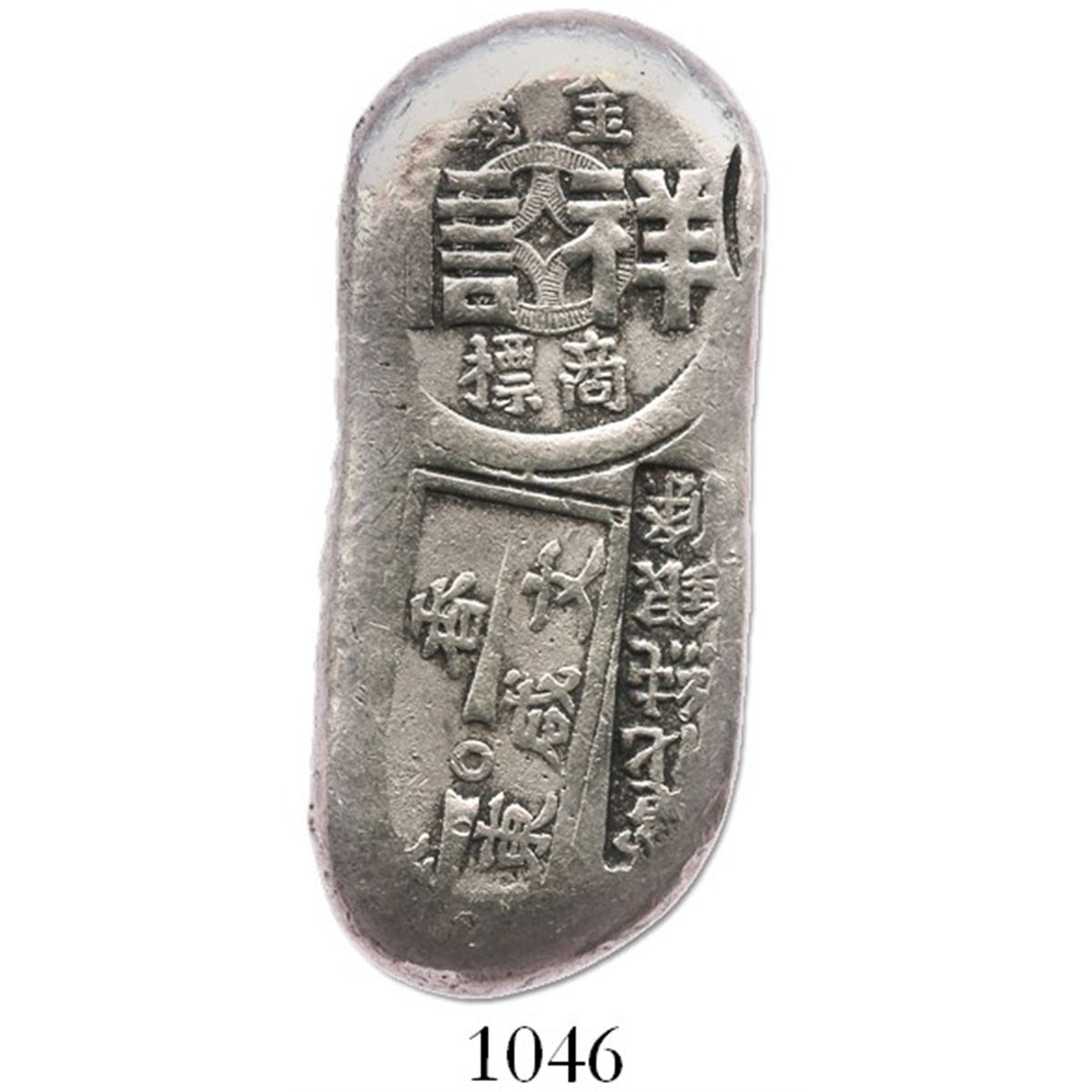 Hong Kong (Xianggang Yintao), China, Xiangxin Gold Shop, silver 1 tael bar (1930s-1941). 37.7 grams. Marked with "Xiang Xin Jin Qian Shang Biao" (Xiangxin Gold Shop, Golden Coin Trade Mark), "Xiang Gang-Wen Xian Dong Jie" (Hong Kong, Wenxian East Street), "Dian Hua Chun Yin Tiao" (electrotypically pure silver bar), and "Xiang Gang Xiang Xin Jin Pu" (Hong Kong, Xiangxin Gold Shop). Highly detailed XF with dark sediment around details.