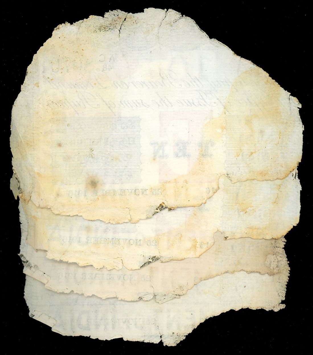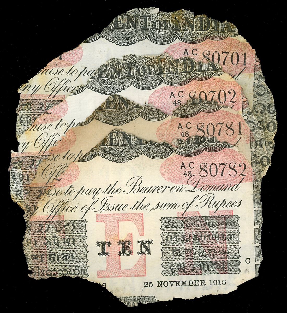 INDIA (British), Calcutta, lot of four 10-rupee notes, 25-11-1916, series AC, various serial numbers (some consecutive). Pick-A10H. Small group with a few consecutive pieces of Indian 10-rupee notes, essentially as recovered with similar edge degradation (all generally 60-70% intact) and mild staining. With salvor's certificates (generic). Recovered from: S.S. Camberwell, sunk in 1917 off the Isle of Wight, south of England