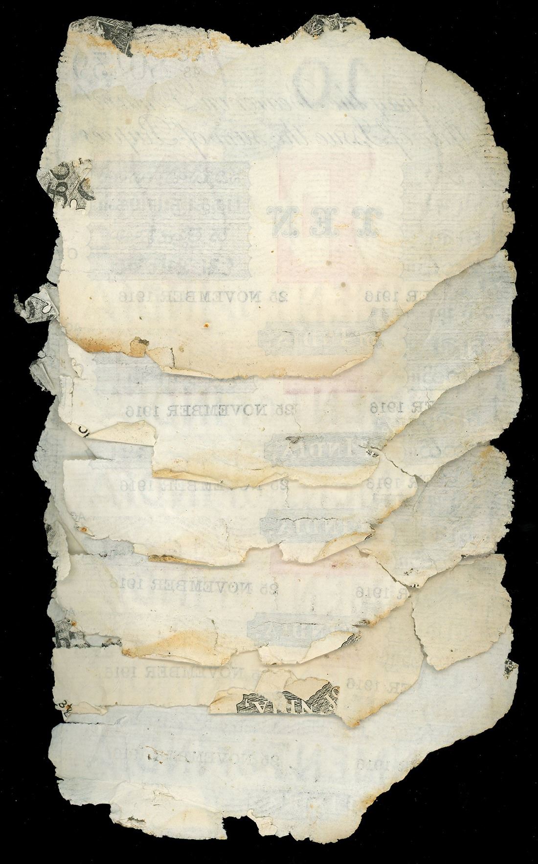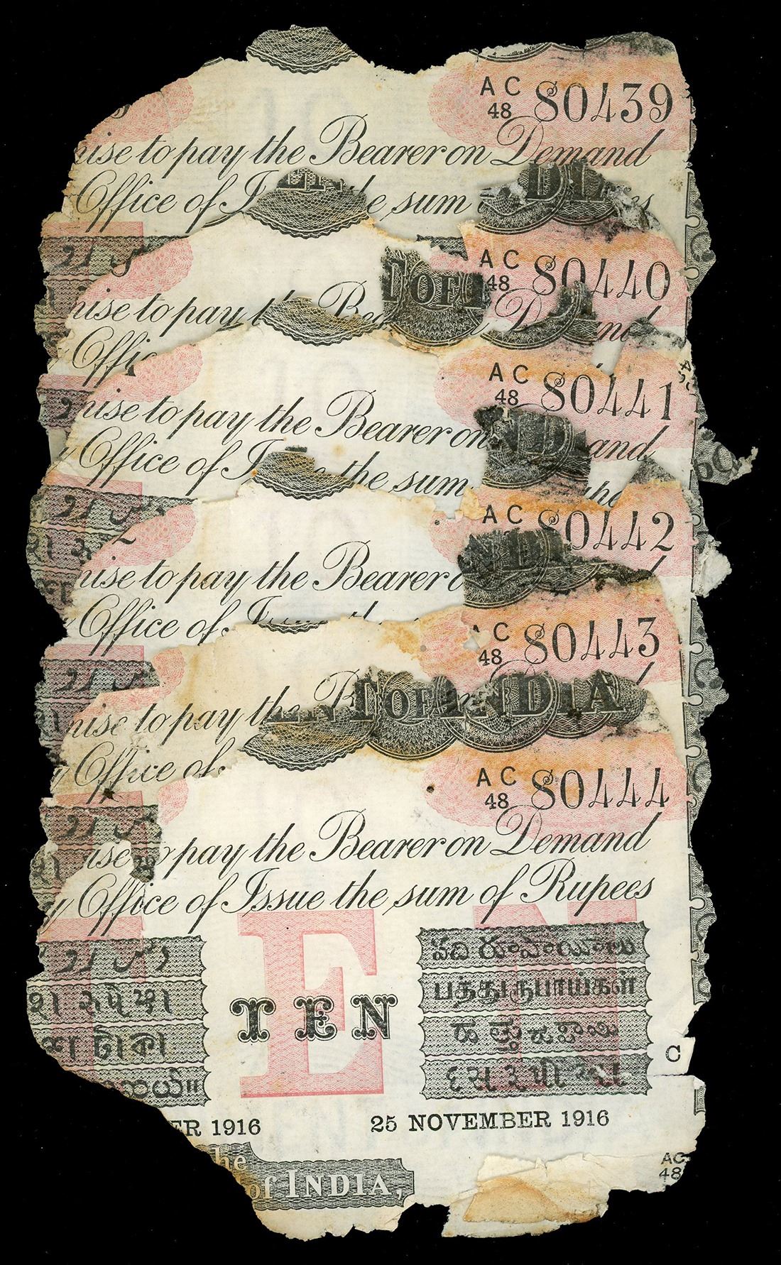 INDIA (British), Calcutta, lot of six 10-rupee notes, 25-11-1916, series AC, consecutive serials 80439-80444. Pick-A10H. Nice consecutive run of Indian 10-rupee notes, essentially as recovered with similar edge degradation (all generally 60-70% intact) and mild staining. With original (generic) certificates from the salvor. Recovered from: S.S. Camberwell, sunk in 1917 off the Isle of Wight, south of England