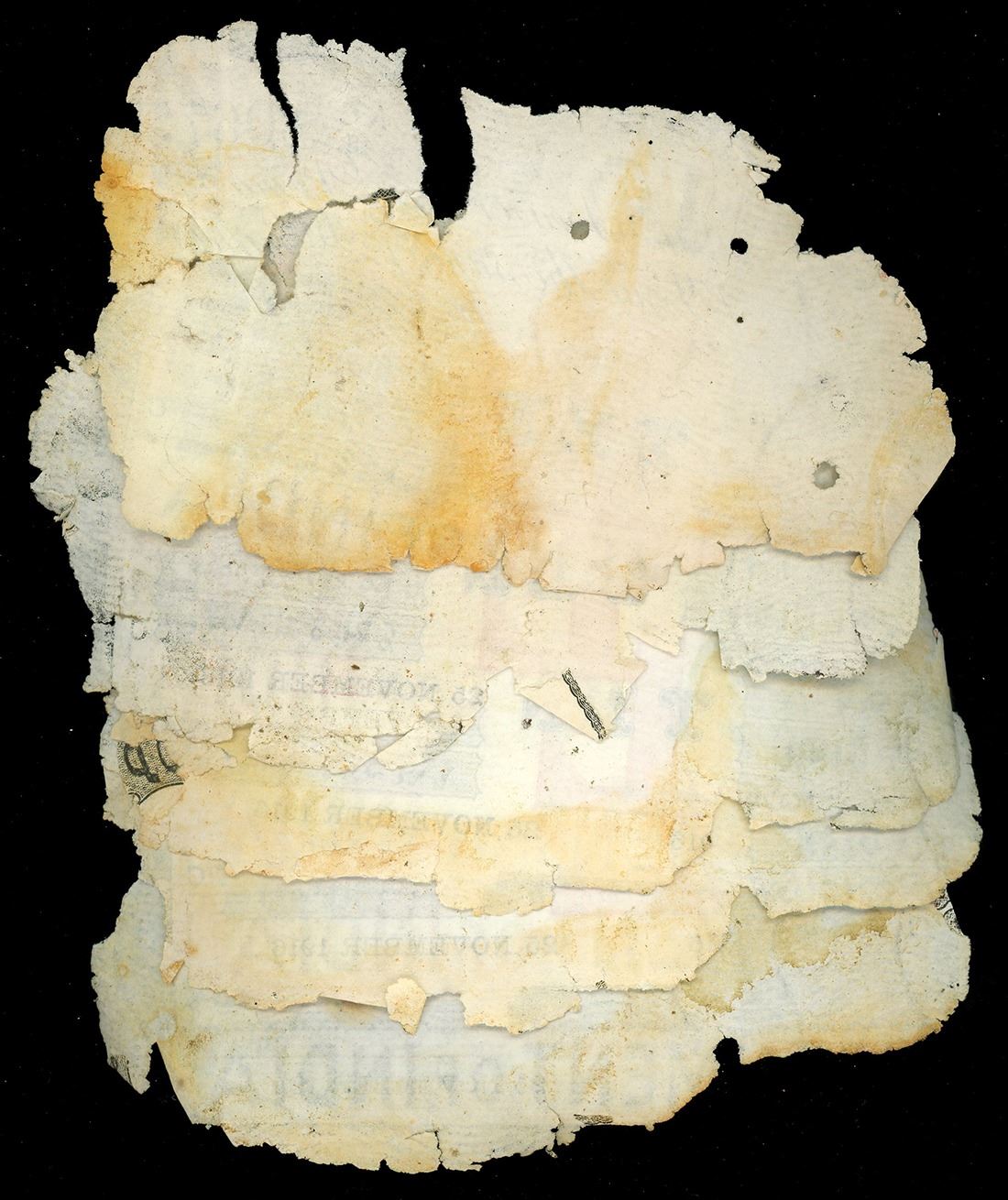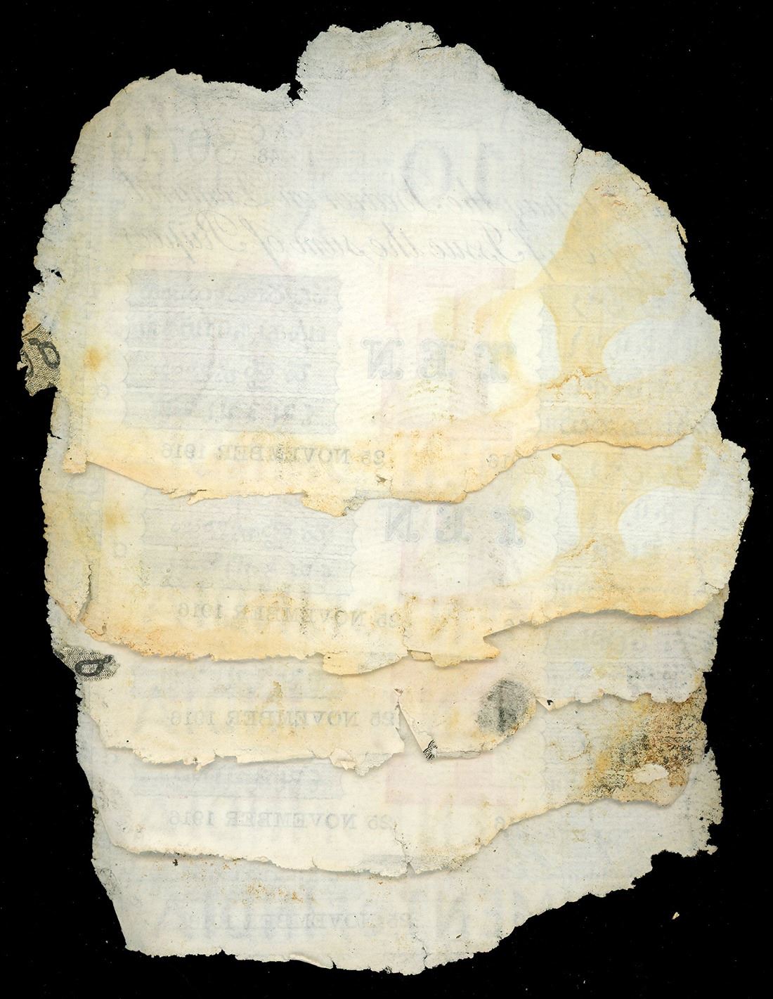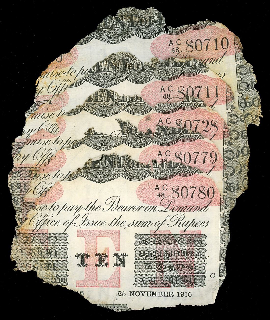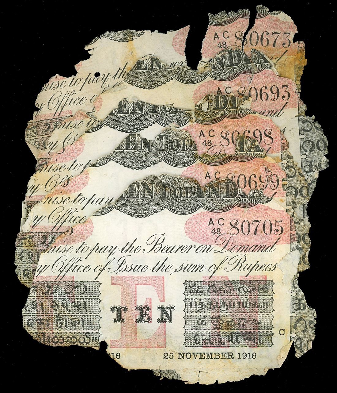 INDIA (British), Calcutta, lot of ten 10-rupee notes, 25-11-1916, series AC, various serial numbers. Pick-A10H. Several Indian 10-rupee notes, essentially as recovered with similar edge degradation (all generally 60-70% intact) and mild staining. With original (generic) certificates from the salvor. Recovered from: S.S. Camberwell, sunk in 1917 off the Isle of Wight, south of England