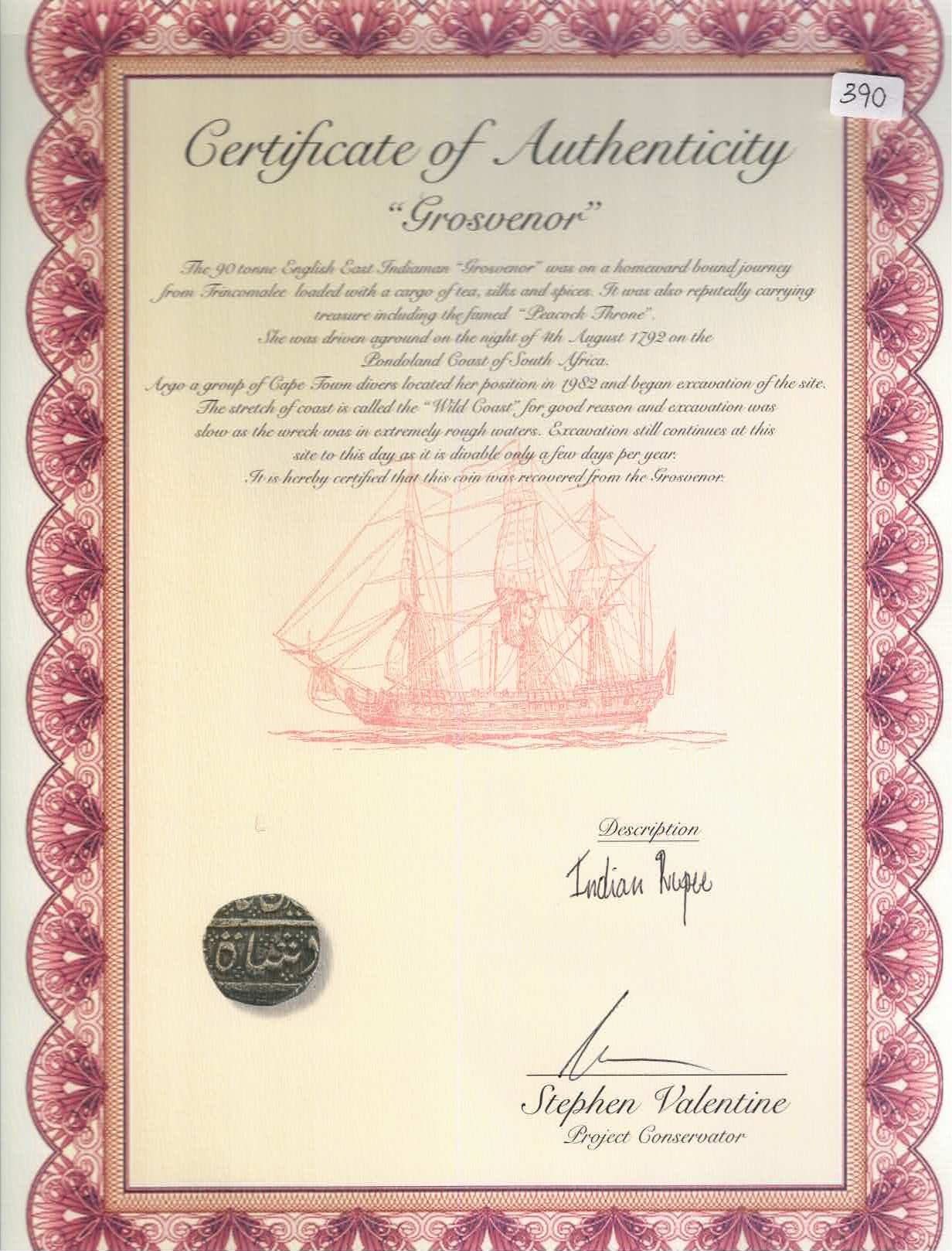 INDIA (British), Madras Presidency, Arkot mint, 1 rupee, regnal year 6 (frozen date / ca. 1759-82), open lotus mintmark. KM-384. 11.54 grams. Attractively toned and corrosion-free UNC, minor edge-bump. With original certificate from the salvor/conservator. Recovered from: Grosvenor, sunk in 1782 off South Africa