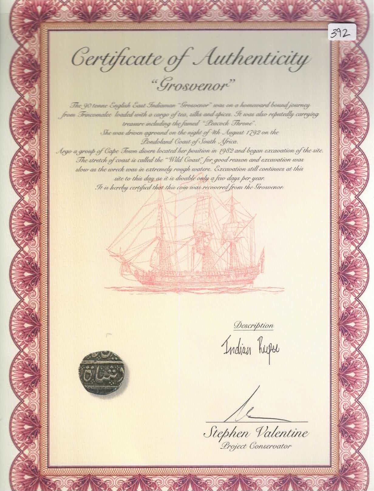 INDIA (British), Madras Presidency, Arkot mint, 1 rupee, regnal year 6 (frozen date / ca. 1759-82), open lotus mintmark. KM-384. 11.43 grams. AU details with practically no corrosion, faint toning. With original certificate from the salvor/conservator. Recovered from: Grosvenor, sunk in 1782 off South Africa
