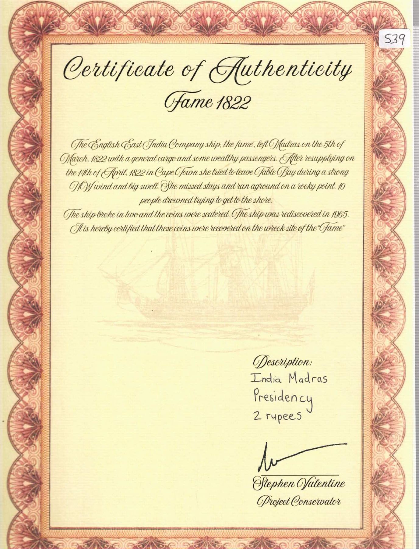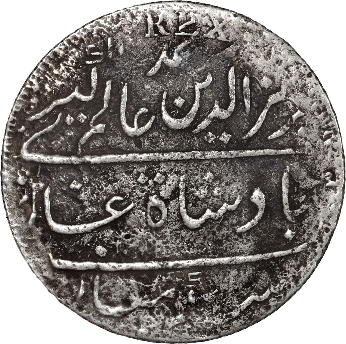INDIA (British), Madras Presidency, Arkot mint, 2 rupees, dated AH 1172 (1758/59), regnal year 6 (frozen, Alamgir II), struck in 1807 over a Lima, Peru, bust 8 reales, Charles IV, assayer JP (1803-7). KM-404.2; Prid-245. 21.55 grams. Full AU details despite corroded surfaces, uneven dark toning, clear REX of undercoin visible along with faint but certain 8R and JP, a scarce and interesting type. Pedigreed to the Steve Valentine Collection, with original certificate from the salvor/conservator. Recovered from: Fame, sunk in 1822 off South Africa