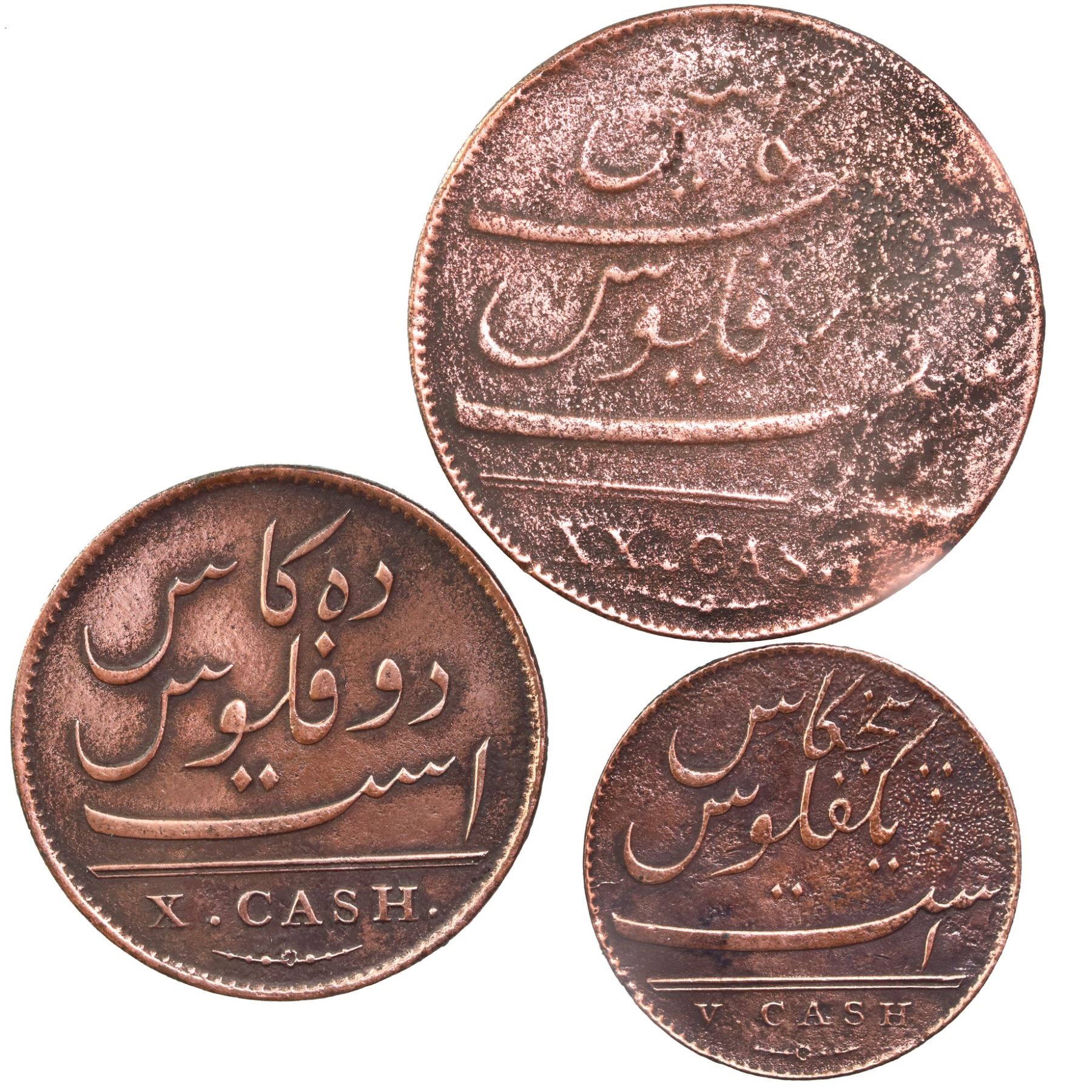 INDIA (British), Madras Presidency, copper denomination set of V, X, and XX cash, 1803.