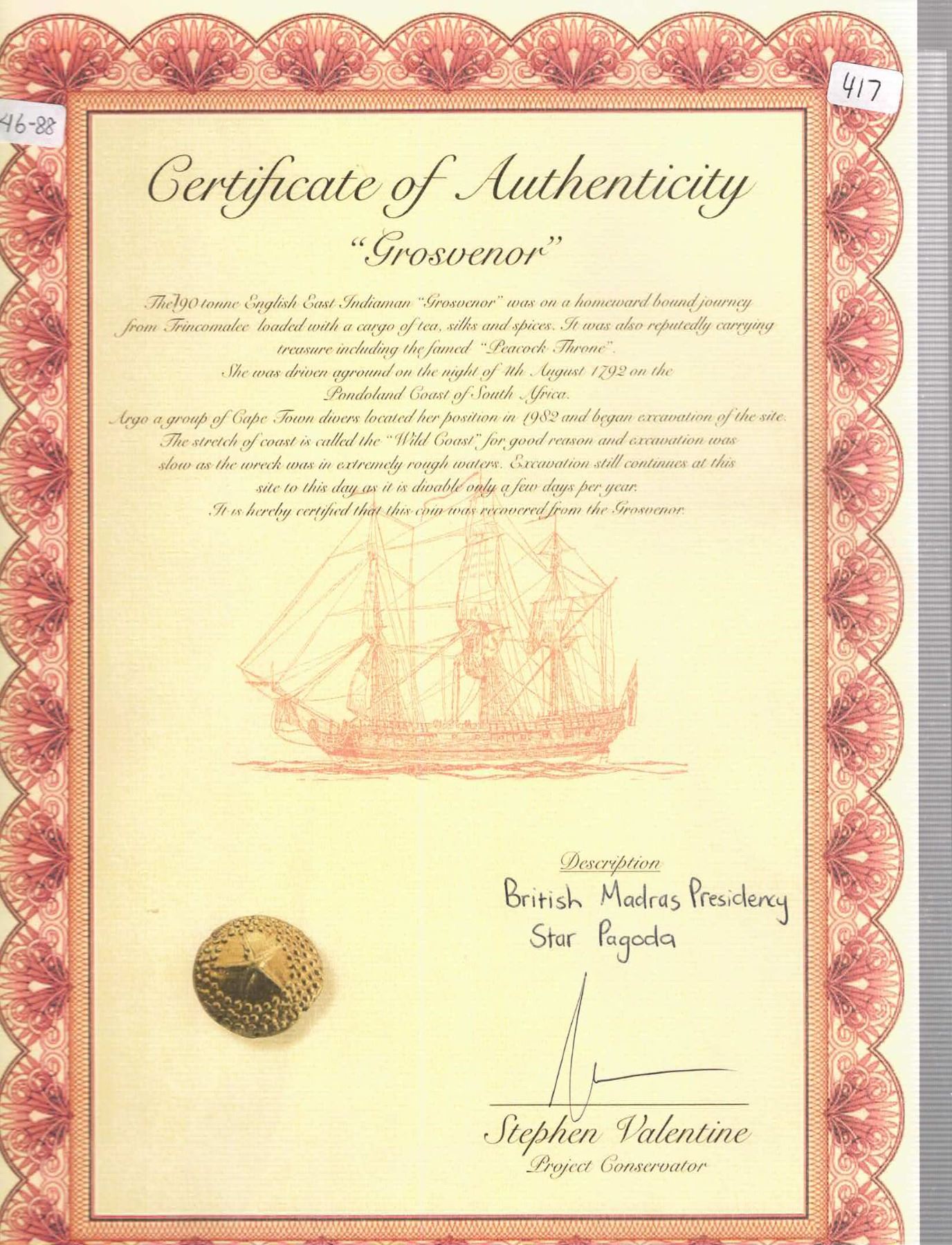 INDIA (British), Madras Presidency, gold "star" pagoda, no date (1740-1807). KM-303; Fr-1578. 3.41 grams. UNC with bold details and nice luster. Pedigreed to the Steve Valentine Collection, with original certificate from the salvor/conservator. Recovered from: Grosvenor, sunk in 1782 off South Africa
