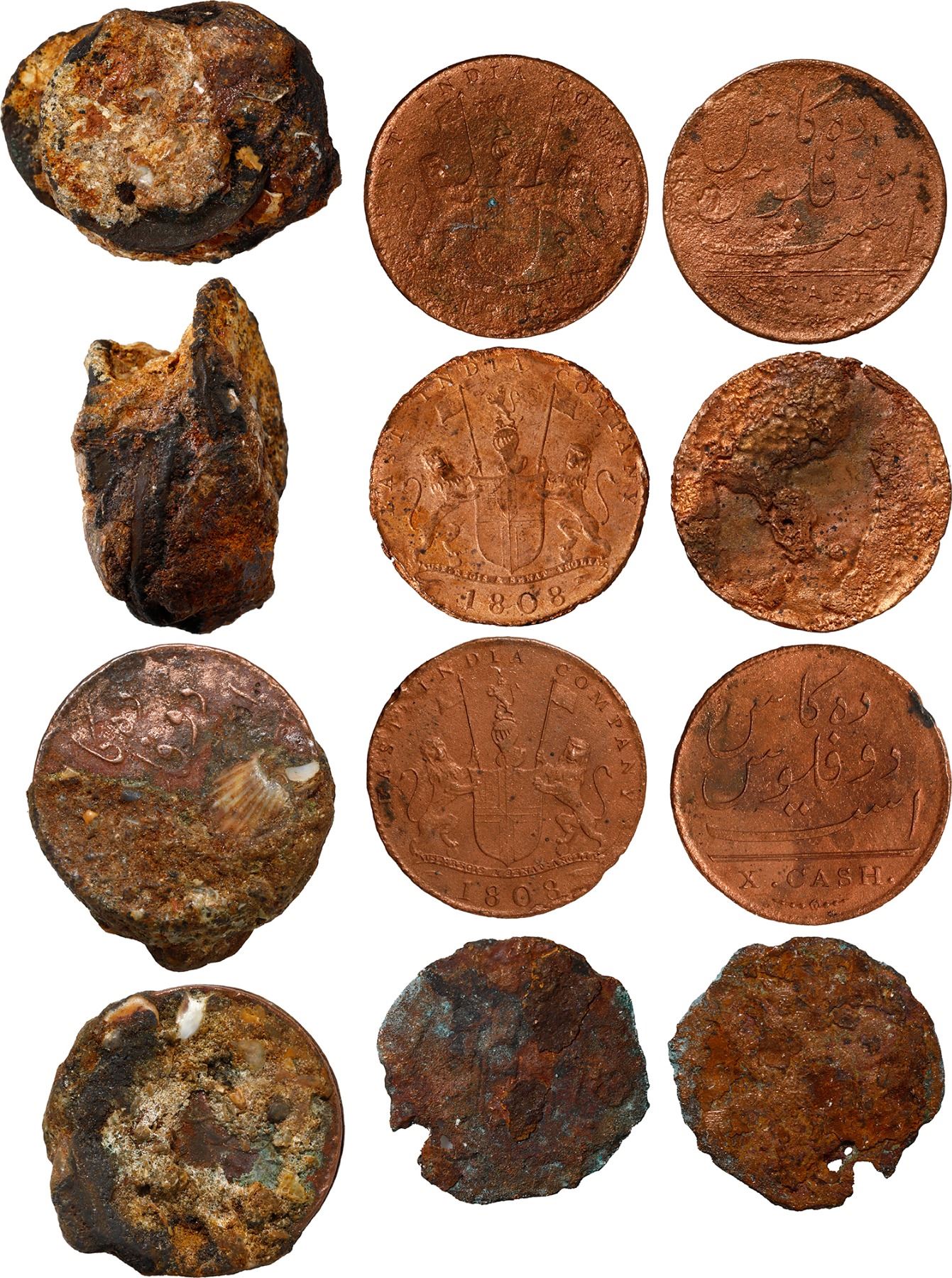 INDIA (British), Madras Presidency, lot of ten X cash (four separate, six in two encrusted clumps), 1808. KM-321. 68.00 grams total. Neat assortment of clumps from this wreck ranging from a heavily encrusted leaning stack to a partially encrusted pairing and finally a scattered clump which has been cleaned up a bit to show off several corroded yet detailed coins. Recovered from: Admiral Gardner, sunk in 1809 southeast of England