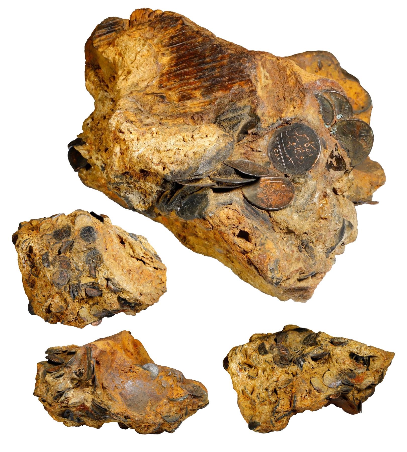 INDIA (British), Madras Presidency, massive 12-lb clump of approx. 450 (+/-) copper X cash treasure coins, 1808, ex-Barfield. KM-319. 12 lb total. Roughly 10" x 7" x 5-½". A truly impressive and massive shipwreck clump, an extraordinary visual specimen with numerous East India Company X cash coins exposed across its surfaces. Many coins are darkened from long submersion, yet dates and principal design elements remain clearly visible. Even allowing a generous estimate of half coins and half encrusted matrix and debris, the piece likely contains approximately 450 coins (+/-). The characteristic rusty orange matrix also preserves fragments of the wooden cask in which the coins were originally stored, along with visible remains of glass and other associated artifact fragments. Notably, a large void on the side shows where a cannonball from the ship once rested. Professionally conserved, revealing clear details across many of the coins as well as the surrounding shipwreck materials. An imposing and highly desirable trophy specimen from this famous wreck. Pedigreed to the Barfield Collection, with photo-certificate. Recovered from: Admiral Gardner, sunk in 1809 southeast of England