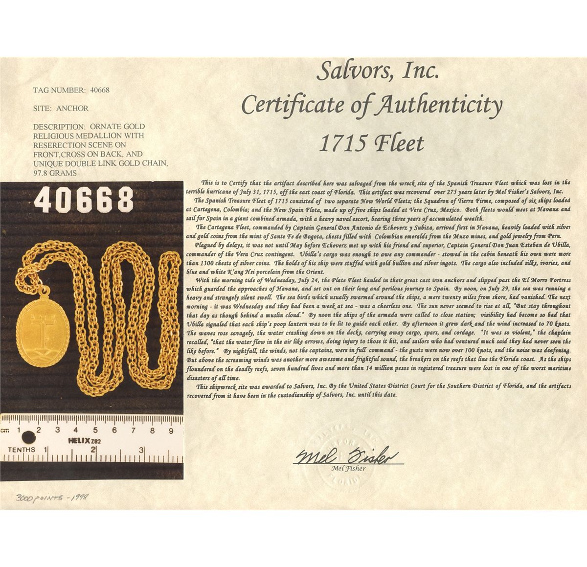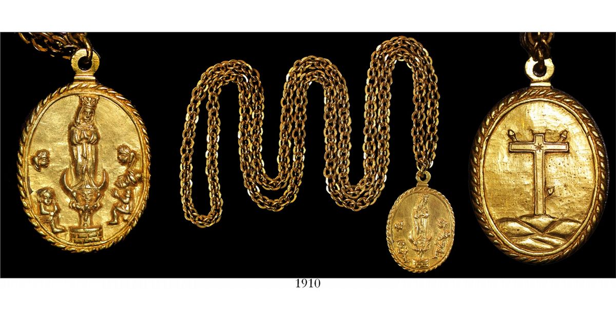 Important gold religious medallion and chain with full research. 98.7 grams total, chain 32" long, the medallion about 1-1/2". This is not just another religious medallion: Made of solid gold and accompanied by its original chain, it bears significant symbols in high relief on both sides that have been thoroughly researched to show that this was likely the possession of a wealthy criollo (colony-born but pureblood Spanish) coming from the New World to Spain. This symbolism comprises a scene of the Virgin Mary on a crescent on top of the baby Jesus with native-looking figures and disembodied heads surrounding her, almost certainly in reference to the Virgen de la Guadalupe, a manifestation of the Virgin Mary to a Mexican native in 1531 and from the mid-17th century onward a revered symbol specifically of the criollo class. On the reverse of the medallion is a cross on the hills of Calvary (where Jesus was crucified), significantly with three nails (possibly stigmata) and a starburst (probably the heart of Christ) but no Jesus figure. The chain consists of hundreds of small, double-ring links, hand-crafted to a high standard. Overall the piece is in a magnificent state of preservation, with no noticeable wear or damage, a relic for all eternity. With original Fisher photo-certificate #40668, an independent analysis report and a copy of Discovery Day Treasures magazine for comparison to similar 6-figure treasures offered by Mel Fisher's companies in 2000. Recovered from: Spanish 1715 Fleet, sunk off the east coast of Florida