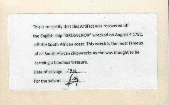 India (Madras Presidency), Arkot mint, 1 rupee, regnal year 6 (frozen date / ca. 1759-82), open lotus mintmark. KM-384. 11.51 grams. Bold AU with toned fields, minimal surface pitting, rare provenance. With original (generic) certificate from the salvagers.Recovered from: Grosvenor, sunk in 1782 off South Africa