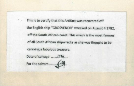 India (Madras Presidency), Arkot mint, 1 rupee, regnal year 6 (frozen date / ca. 1759-82), open lotus mintmark. KM-384. 11.38 grams. Bold strike with minimal surface oxidation, AU or so, toned, rare provenance. With original (generic) certificate from the salvagers.Recovered from: Grosvenor, sunk in 1782 off South Africa
