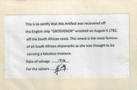 India (Madras Presidency), Arkot mint, 1 rupee, regnal year 6 (frozen date / ca. 1759-82), open lotus mintmark. KM-384. 11.46 grams. Bold AU with minor spots of oxidation, deeply toned, rare provenance. With original (generic) certificate from the salvagers.Recovered from: Grosvenor, sunk in 1782 off South Africa