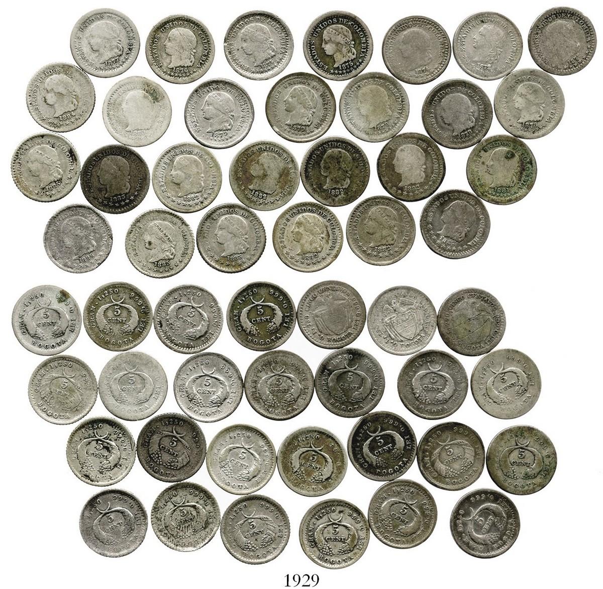 Instant collection! Lot of 27 Bogota, Colombia, 5 centavos: 1872 (2), 1874, 1875 (2), 1876, 1877, 1878 (2), 1879 (3), 1880, 1881, 1882 (7), 1883 (2), 1884, 1885 (3). 1.0 to 1.3 grams each. AVF on average, mostly lightly toned, with no big problems, great group for study or resale (or to start a new collection). Pedigreed to the Herman Blanton collection.