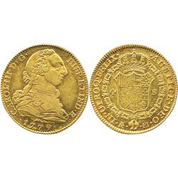Madrid, Spain, bust 4 escudos, Charles III, 1779PJ. CT-303; KM-418.1. 13.5 grams. Lustrous AU- with adjustment marks in center of reverse, lightly ton