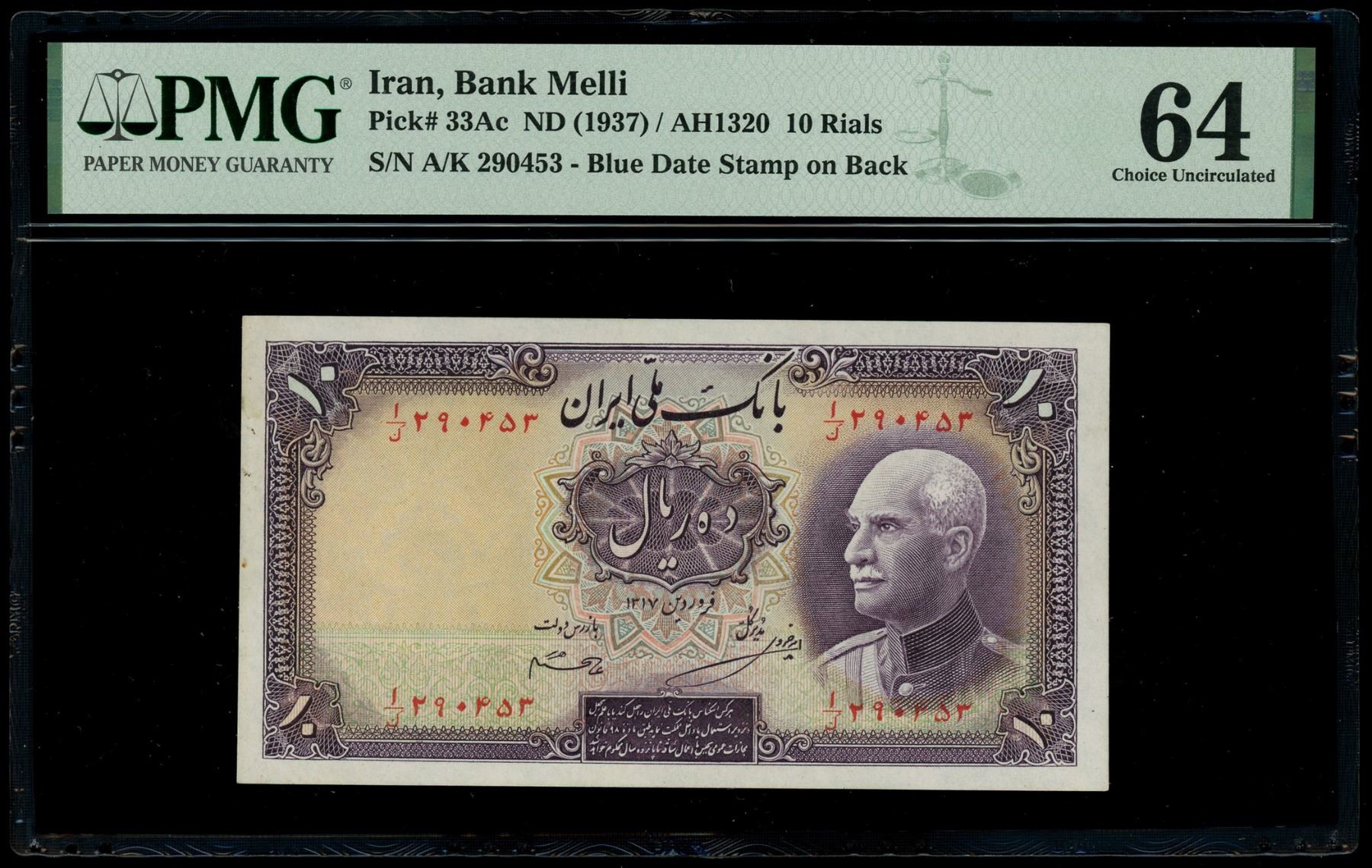 Iran, Bank Melli, 10 rials, AH1320 (1937), serial A/K 290453, blue date stamp on back, PMG Choice UNC 64. SCWPM-33Ac. Bold design with choice margins, bust of Reza Shah to right (forced to abdicate in 1941 by British and Russian forces).