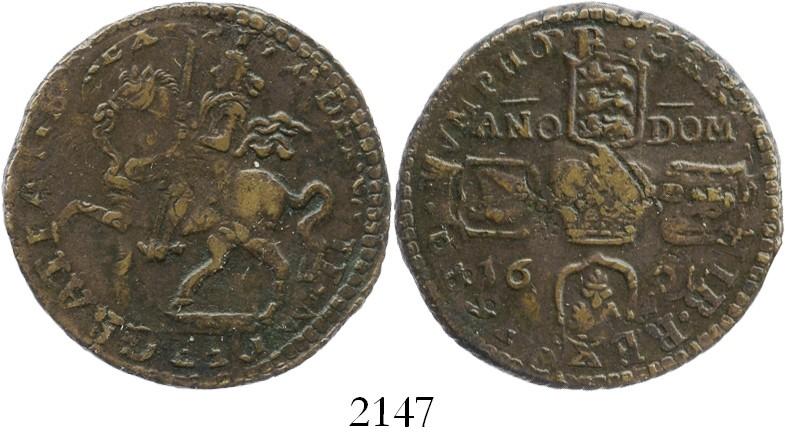 Ireland, copper "gunmoney" crown, James II, 1690, struck over a 1689 half crown (both dates visible). Sp-6578. 15.6 grams. Chocolate-brown VF+ with traces of undercoin visible, second "small" issue with new design disguising a devaluation by half and omitting the month of issue (as redemption became less certain).