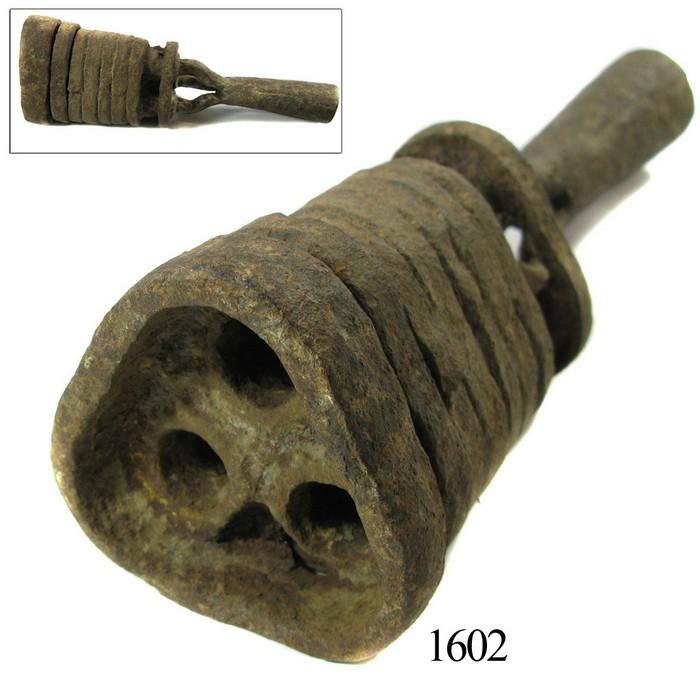 Iron Chinese pole-cannon, 1700s. 3 lb 6 oz, 8½" tall and 3" in diameter. A very strange weapon (first we have seen) with three holes in one end (with 6 lateral reinforcements) in which shot and powder were loaded, the other end a cylindrical receptacle for a wooden pole, very heavy and solid, lightly encrusted. Can you imagine the recoil?