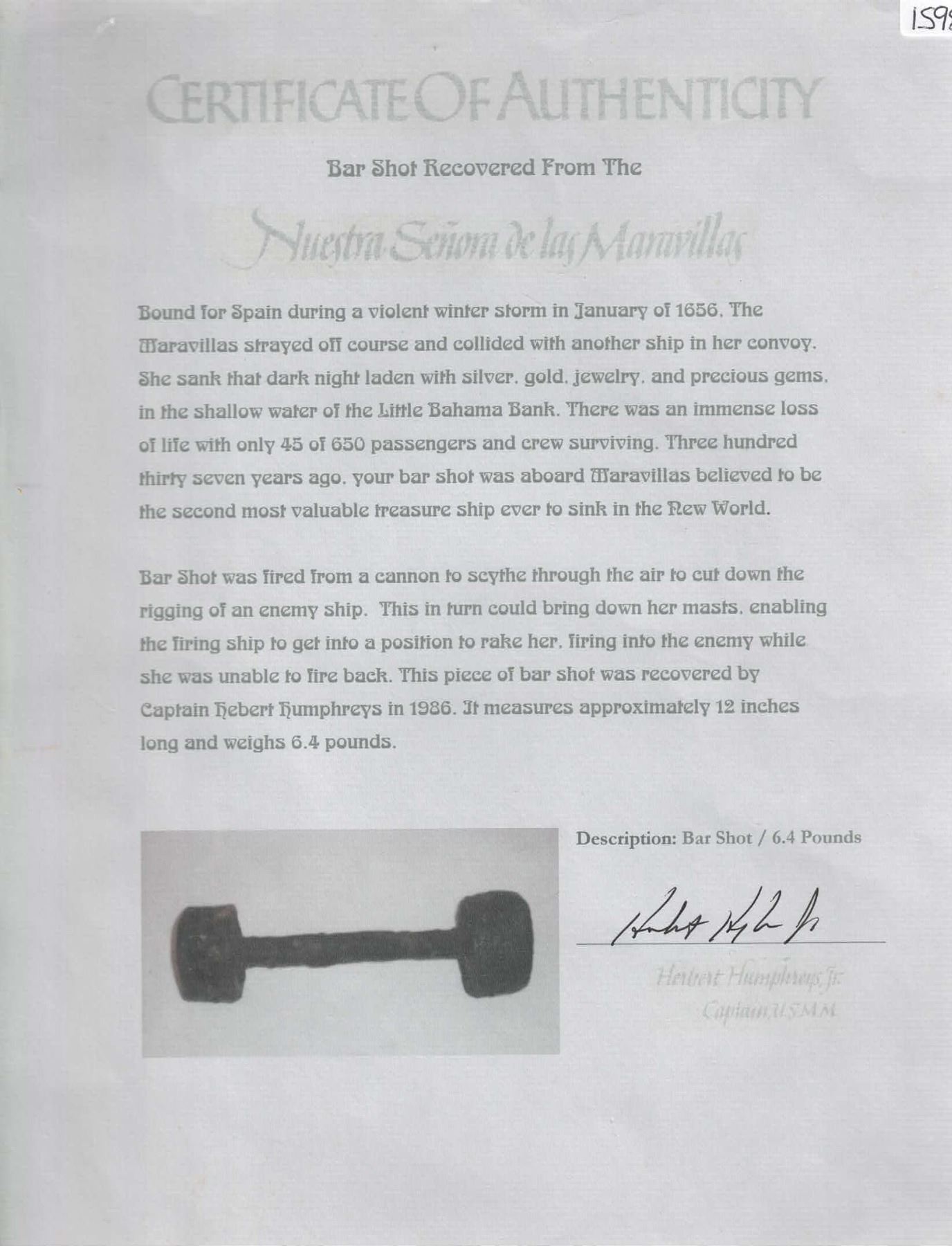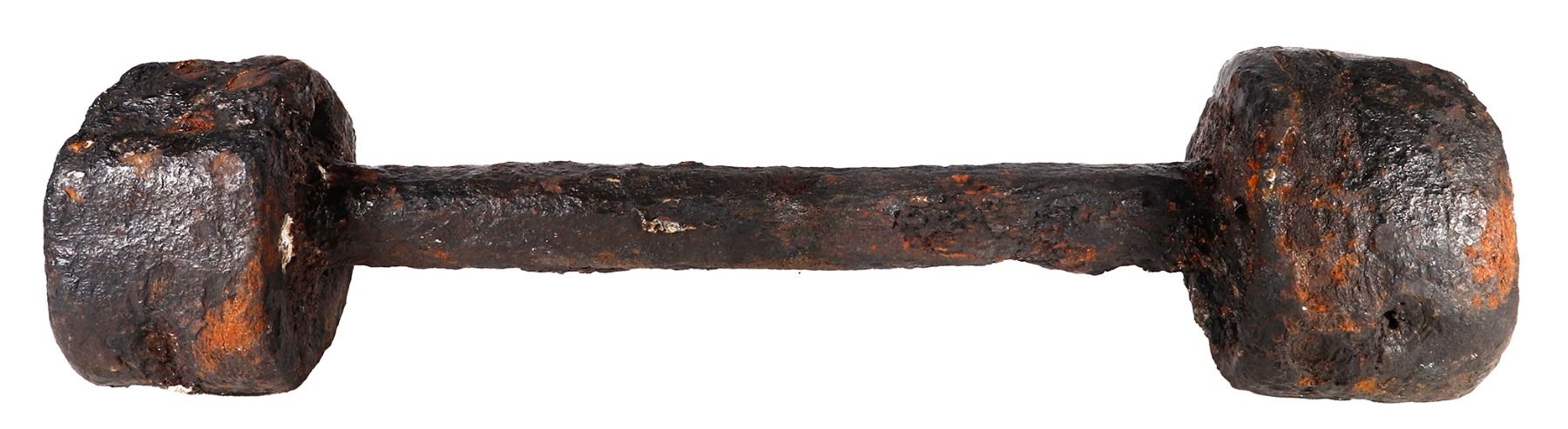 Iron barshot, professionally conserved, complete and intact, ex-Maravillas (1656), ex-Humphreys. 6.71 lbs (3046 grams). 12" long. Typical barshot with two cylindrical pucks (2½" in diameter and 2" thick) connected by a long bar (7½" long), used as a whirling projectile designed to cause maximum damage to a ship's sails, rusty and corroded but stable, particularly desirable from this popular wreck. From the Maravillas (1656), with original Herbert Humphreys photo-certificate.