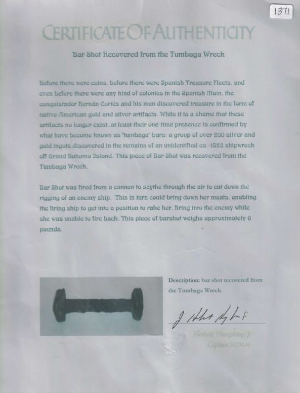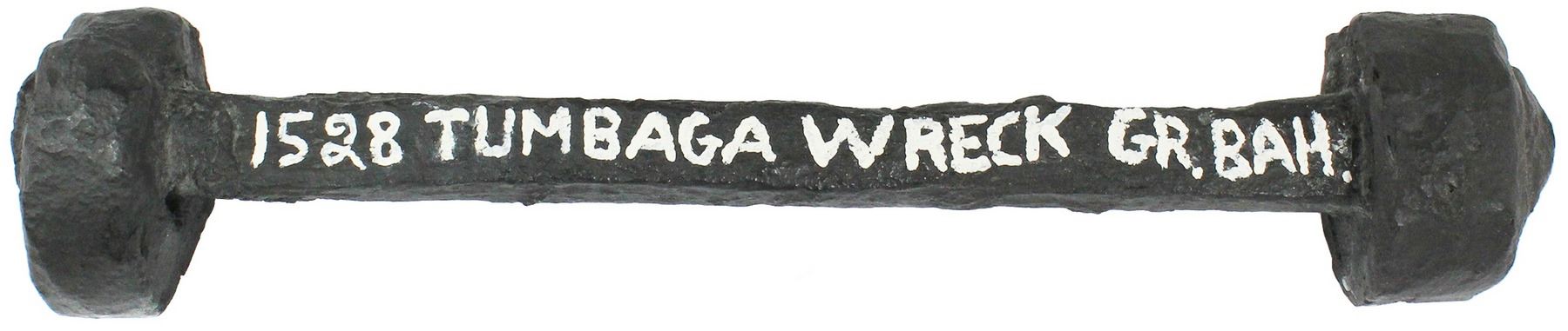Iron barshot, professionally conserved, ex-"Tumbaga wreck" (ca. 1528). 2585 grams, 13-1/2" long, 2-1/2" in diameter. Early form of barshot with the puck-like ends somewhat octagonal and with the square-shank connector bar protruding out each end, very solid and well-preserved, the only one of its kind we know of from this important wreck, matte-black coating all over. White lettering with "1528 Tumbaga Wreck Gr. Bah." on one side of bar. From the "Tumbaga wreck" (ca. 1528), with photo-certificate signed by Herbert Humphreys, Jr.. Pedigreed to our Auction #8, lot 2408.