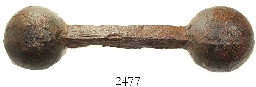 Iron barshot with spherical ends. 11 lb, 12-1/2" long, each ball 3-1/2" in diameter. Two typical cannonballs with square-shank bar between them, used to foul rigging, the rough and rusty surfaces stabilized and sealed, completely intact. From the Spanish 1733 Fleet, Florida Keys, with DHL Rare Coins photo-certificate.