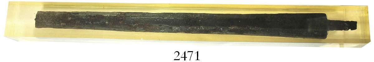 Iron blunderbuss barrel encased in Lucite. 2425 grams, 20" x 1-3/4" x 2". Surviving shipwreck iron is a rarity, so this 17-1/2"-long octagonal-to-round blunderbuss (missing the front few inches) with still-visible touchmarks on top is one-of-a-kind and only continues to avoid rusting away by having been sealed permanently in solid, clear plastic for one of Marty's many museum displays. From the Spanish 1733 Fleet, Florida Keys, pedigreed to the Marty Meylach collection.