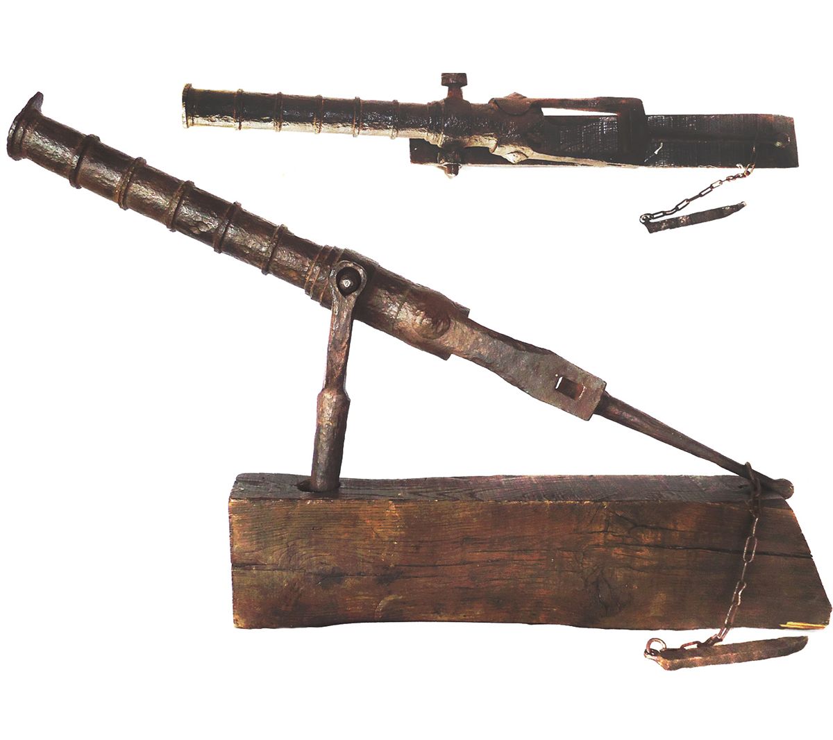 Iron breech-loading swivel cannon (rare), English, 1500s-1600s, with wooden block mount. 80 lb, 50" long (cannon only). Impressive early piece with crude forged-iron design, the plain 3" muzzle with triangular sight (1-3/4" bore), followed by 5 reinforces and 2" trunnions with simple yoke, the open breech with rectangular holes in sides corresponding to an accompanying bar attached by chain, ending in a 14-inch, ball-tipped tiller, the entire surface dark brown (not rusty) and lightly corroded (probably salvaged at some point), the block mount a simple, dark-stained beam. Pedigreed to the Bonhams (Knightsbridge) auction of November 28, 2007 (lot 184).