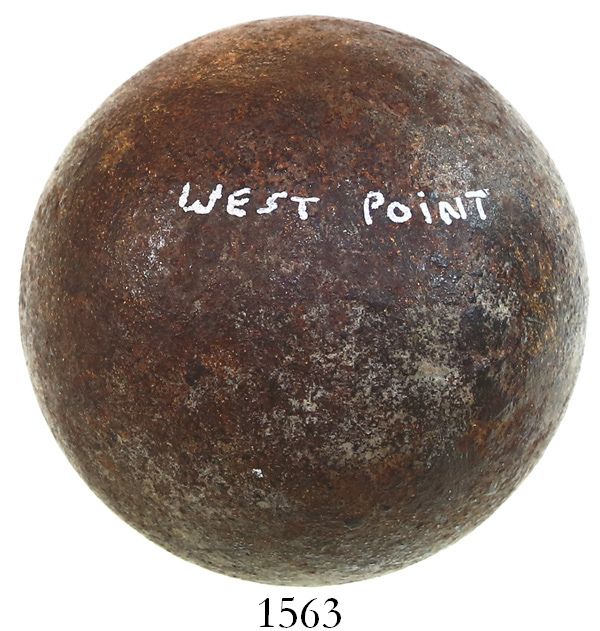 Iron cannonball (6 pounder) from West Point, New York, American Revolutionary War period. 2821 grams, 3-1/2" in diameter. Choice original condition, with no pitting or corrosion, just a smooth, rusty-brown color all over, with WEST POINT in silver ink on side.