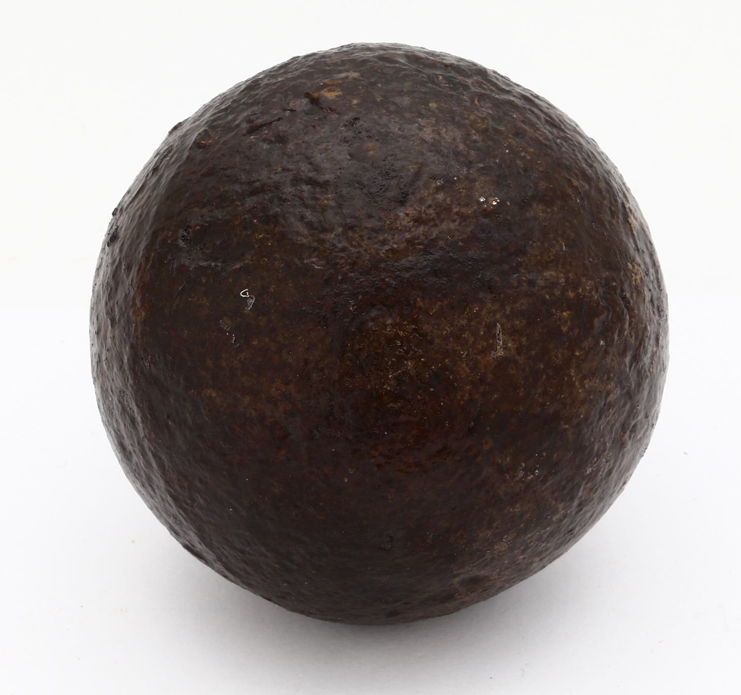 Iron cannonball (three-pounder), conserved and intact, ex-Florida Keys wreck (early 1700s).