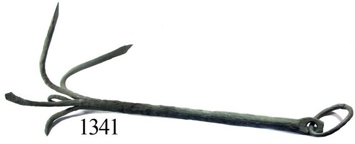 Iron grappling hook, professionally conserved. 3 lb, 18" long. Nearly intact 4-pronged grappling hook, 3 of the points still sharp but the fourth one mostly missing, full ring at top and even a smaller ring at bottom, all a dull steel gray, its layer of rust professionally removed to expose grainy metal with joints where the prongs meet the shaft, believed to have been lost during a search for a Spanish Fleet sunk in the same area in 1605. Recovered from: Unidentified Dutch wreck sunk in 1657 off Grand Bahama Island.