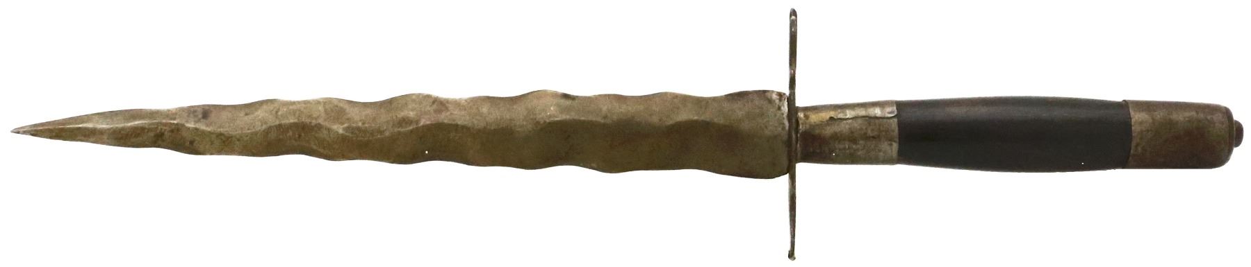 Iron sailor's dirk, Spanish colonial, ca. 1800. 254 grams, 15" long overall. Distinctive wavy blade design (inspired by the moro kris knives of the Spanish Philippines), iron cross guard with decorative cutouts, and turned ebony wood handle with iron mounts. Overall good condition with uncleaned aged and toned surface. With photo-certificates.