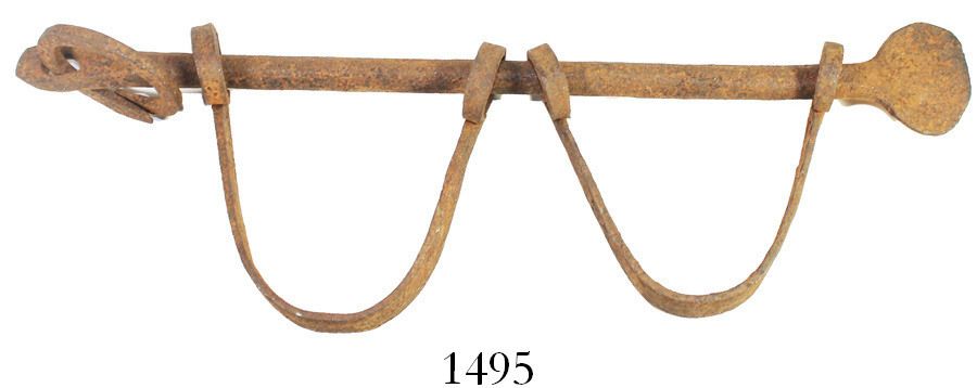 Iron slave-transport shackles, early 1800s, from West Africa. 376 grams, 12" long, each cuff about 3" wide. This hand-forged item appears to be for securing the wrists of a slave on board a ship, with both cuffs slid onto a straight rod that terminates in a flat stop on one end and a loop with ring on the other end, rusty but solid. Found at a trading site on the Congo River, with photo-certificate.