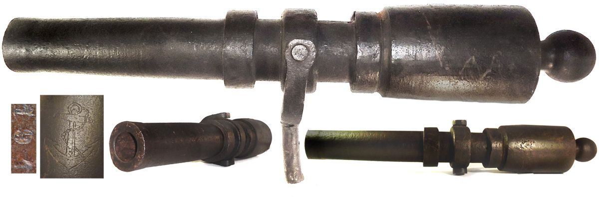 Iron swivel deck-cannon, US or French naval, mid-1800s. 83 lb, 29" long. Short, heavy, thick-walled cast iron with characteristic "wraparound" behind the touch-hole to prevent bursting (a design typical of Civil War-era "Parrott rifles"), tapered muzzle with 1-3/4" bore, simple yoke, ball-type cascabel, small touch-hole in recessed area behind trunnions, two small holes on bottom and engraved anchor mark on top, number 191 stamped on chase, dark brown color (not rusty).