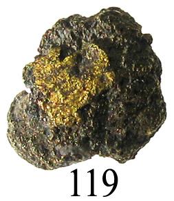 Irregular "blob" gold nugget, from the Espadarte (1558). 3.2 grams, about 3/8" in diameter and 3/16" thick. Somewhat roundish mound of gold that is either a natural nugget or a drip of refined gold, loaded with gray sediment and coral, undoubtedly used as a coin-like unit and therefore of significant numismatic value. From the Espadarte (1558), with Arqueonautas certificate #IDM-006/02/0913.