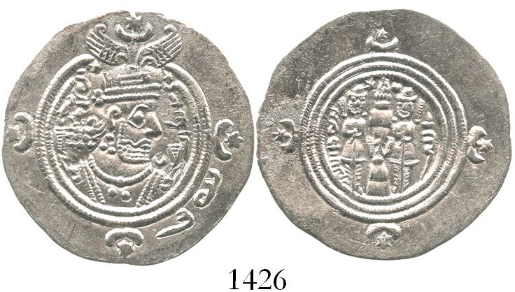 Islamic Dynasties, Arab-Sasanian, Khusro II, AR drachm, 590/1-628 AD, dated year 36 (626 AD). Gobl I/3. 4.1 grams. Crowned bust right / Fire altar flanked by attendants; star and crescent above. Lustrous AU.