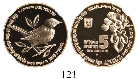 Israel, proof 5 new sheqalim, 1996, nightingale and fig tree, encapsulated NGC PF 70 Ultra Cameo, finest known specimen in NGC census. KM-293. Flawless Proof, highest grade possible, one of only 805 struck.
