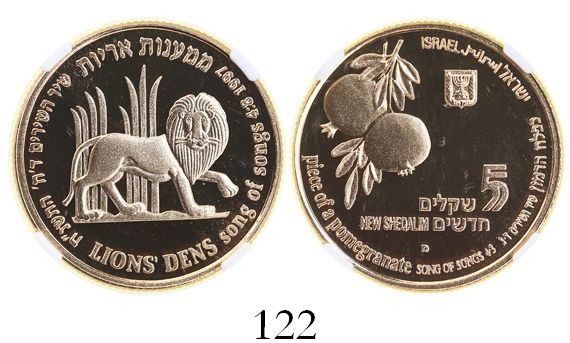 Israel, proof 5 new sheqalim, 1997, pomegranates and lion, encapsulated NGC PF 69 Ultra Cameo, tied
