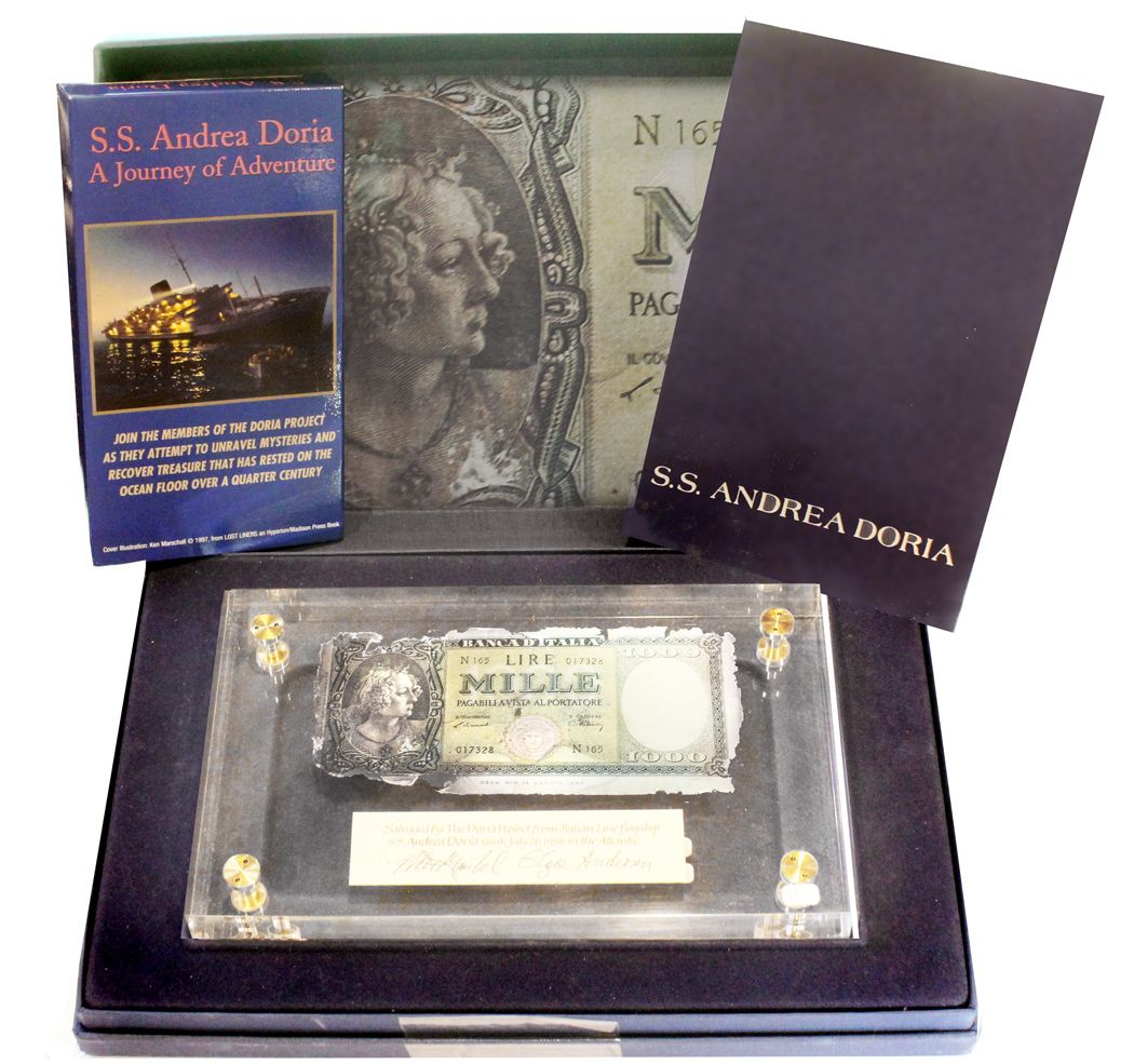 Italian 1000-lire banknote of 1947 recovered from the wreck, encased in Lucite with hand-signed card from the salvagers, and housed in a custom box with booklet and VHS tape. 12-1/2" x 8-1/2" x 2" (in box). Paper money from a shipwreck is a near-impossibility; but in 1984 divers recovered a safe from this famous wreck and found it to contain intact banknotes like this one, with a little bit of edge loss but otherwise as well-detailed and colorful as the day it was lost, here elegantly displayed and housed. The New York-bound Italian luxury liner Andrea Doria famously sank after a collision off the coast of Nantucket, Massachusetts in 1956, in effect closing the era of transatlantic travel by ship (planes being preferred ever since). Today the Doria is known as the "Mount Everest of scuba diving," for its depth of well over 150 feet requires mixed gas and staged decompression, not to mention the frigidity of the water and dangerous currents, and also falling rigging and fishermen's nets. The few artifacts available today from this wreck must be appreciated not only for the initial tragedy but also for the difficulty with which they were obtained. Recovered from: Andrea Doria, sunk in 1956 off Massachusetts